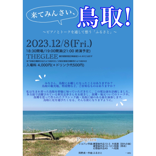 来てみんさい、鳥取!〜ピアノとトークを通して想う「ふるさと」〜