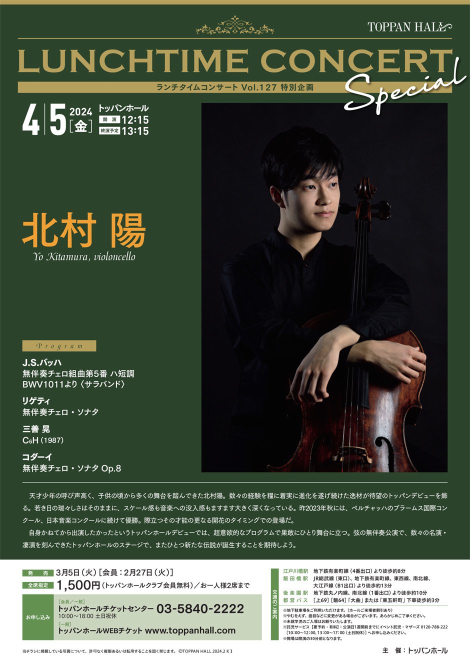 〈ランチタイムコンサート Vol.127〉特別企画/北村 陽(チェロ)【完売】
