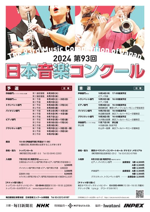 | 聯絡我們 | [チケットのお申し込み] トッパンホールチケットセンター 03-5840-2222(平日10:00~18:00) [日本音楽コンクールに関するお問い合わせ] ■毎日新聞社事業本部内 日本音楽コンクール事務局 03-3212-0187(平日10:00~18:00) ■予選開催日事務局 080-8469-7612 |