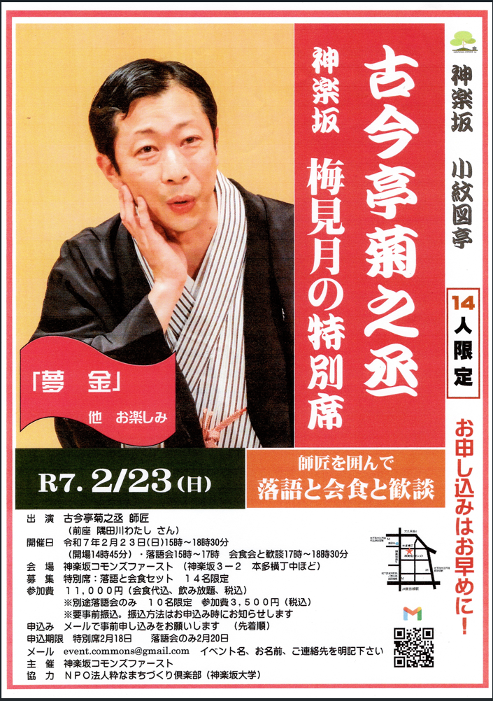 神楽坂小紋図亭 人数限定、「古今亭菊之丞 神楽坂 梅見月の特別席」(落語と会食と歓談)