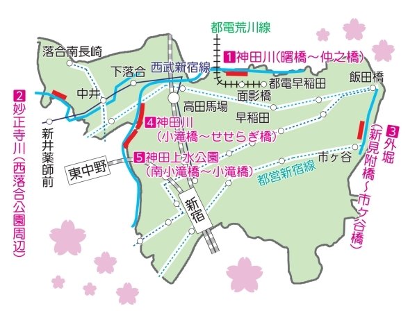 | 地點 | [1]神田川、[2]妙正寺川、[3]外濠、[4]神田川、[5]神田上水公園 |