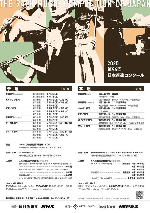 | 聯絡我們 | [主催]毎日新聞社 NHK [協賛]三井物産株式会社/岩谷産業株式会社/株式会社INPEX [会場協力]TOPPANホール [チケットのお申し込み] TOPPANホールチケットセンター 03-5840-2222(平日10:00~18:00) [日本音楽コンクールに関するお問い合わせ] ■毎日新聞社事業本部内 日本音楽コンクール事務局 03-3212-0187(平日10:00~18:00) ■予選開催日事務局 080-8469-7612 ■公式WEBサイト https://oncon.mainichi-classic.net/ |