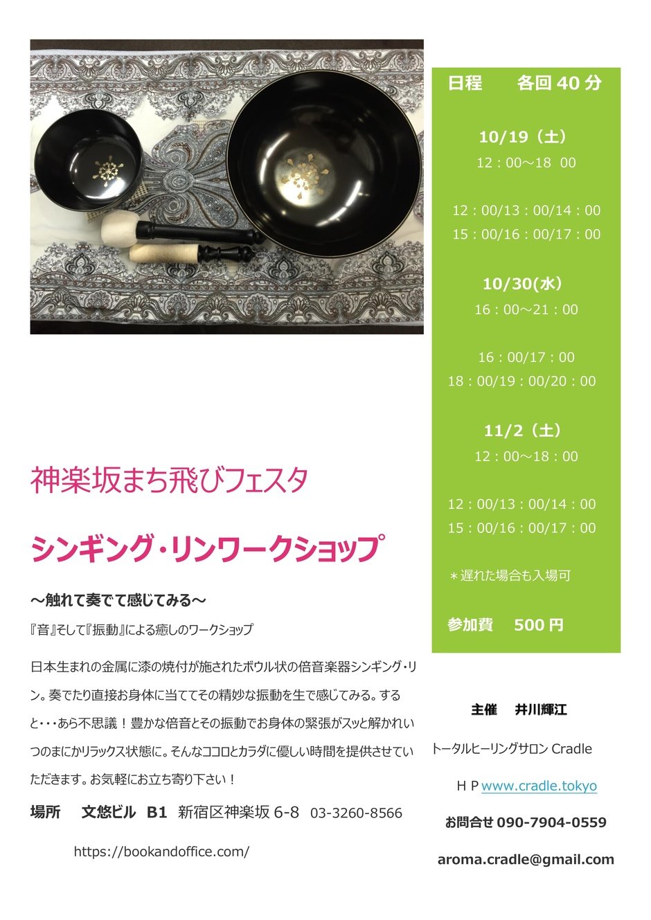 日本生まれの金属に漆の焼付が施されたボウル状の倍音楽器「シンギング・リン」奏でたり直接お身体にあててその精妙な振動を生で感じてみる。すると・・・あら不思議! 豊かな倍音とその振動でお身体の緊張がスッと解かれいつのまにかリラックス状態に。そんなココロとカラダに優しい時間を提供させていただきます。