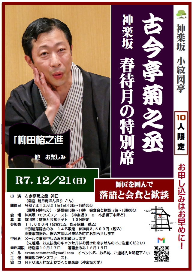 神楽坂コモンズ1st主催、古今亭菊之丞師匠をお招きし、師匠を囲んで落語と歓談と会食を楽しんで頂ける、人数限定の特別席のご案内です。12月(春待月)の会も、贅沢に、たっぷりの江戸前落語と、師匠を交えての楽しい宴席をお楽しみ下さい。