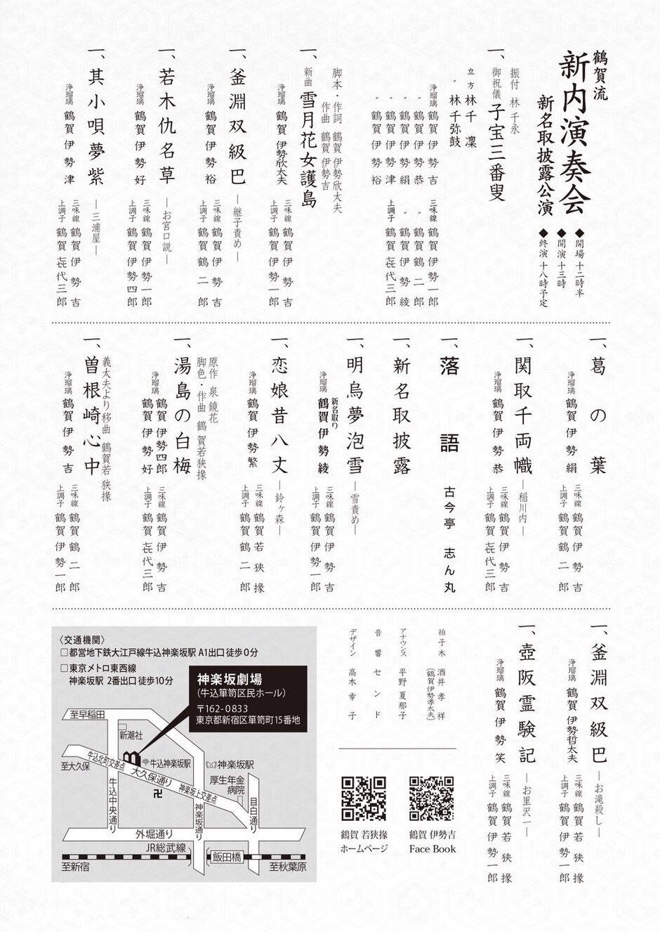 | 聯絡我們 | 鶴賀若狭掾 稽古場: 162-0825 東京都新宿区神楽坂6-27 問い合わせ先: 鶴賀伊勢吉 TEL:090-5390-2447 isekichi3@gmail.com |
