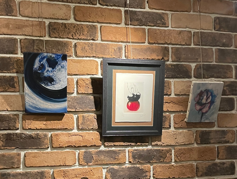 ピアノ左横レンガ壁:アクリル画「宇宙」「ベア」「薔薇」Sayuri Kobayashi、