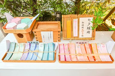 短冊(初穂料300円)は織姫短冊・彦星短冊・幸せ星短冊の3種類があり、授与は6月1日から7月7日まで行います。