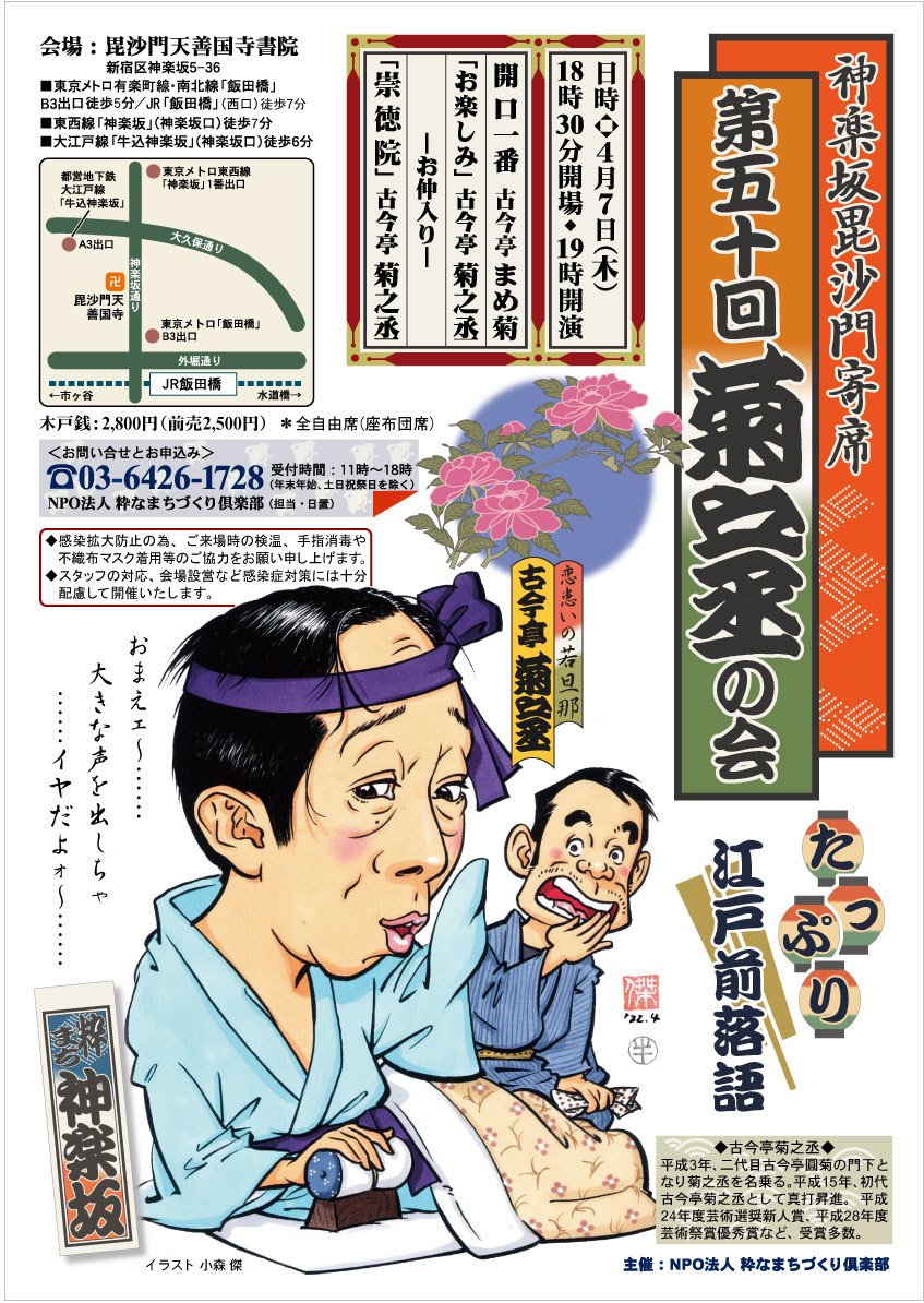 | 地點 | 神楽坂 毘沙門天 善国寺書院 (神楽坂5-36) JR飯田橋駅、西口 徒歩10分 有楽町線飯田橋駅 B3出口 徒歩5分 東西線神楽坂駅(神楽坂口) 徒歩7分 大江戸線牛込神楽坂駅 A3出口 徒歩6分 |