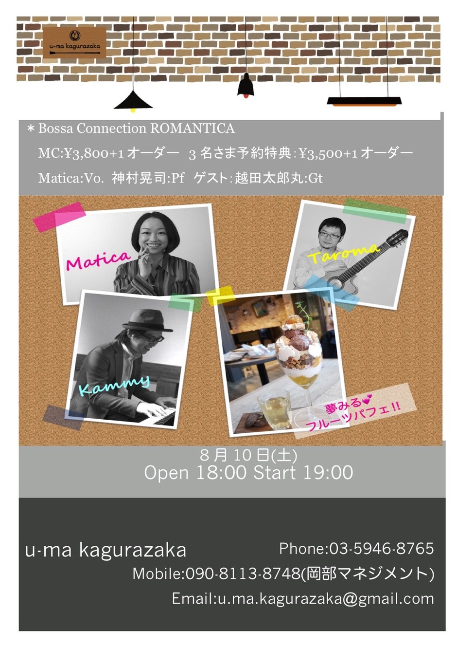 | 參加費用 | MC:¥3,800 トリオ割引:¥3,500 + 1ドリンク (u-maベジプレート:¥1,000 Jonaさんのパフェ:¥1,200 完全予約制) |
