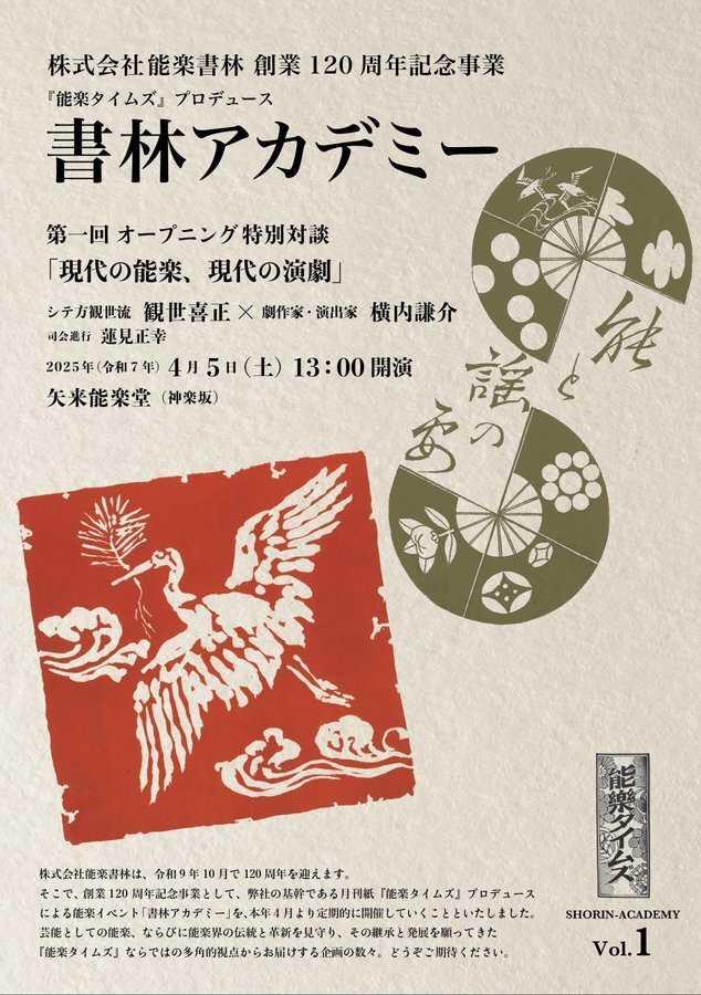 そこで、創業120周年を記念事業として、弊社の出版母体である月刊誌『能楽タイムズ』プロデュース、による能楽イベント「書林アカデミー」を今年4月より定期的に開催していくことといたしました。