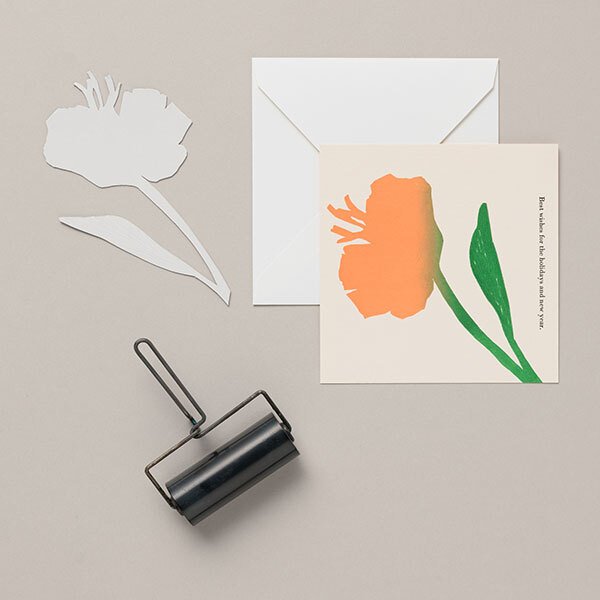 厚紙で好きな絵柄の版をつくり、グリーティングカードを印刷します。欧文活字を組み、メッセージも入れることができます。