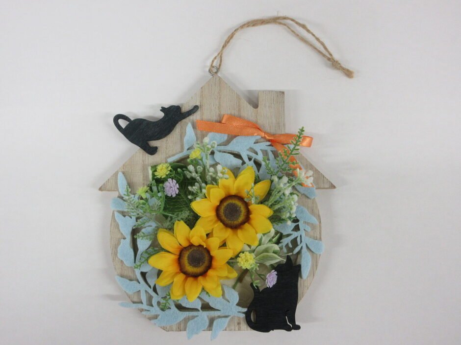 家のかたちのフレームにアーティフィシャルフラワーやリボンなどを貼って、オリジナルのネコのお家を作ります。