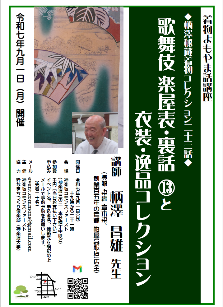 神楽坂コモンズファースト講座 着物・染め物よもやま話「柄澤昌雄コレクション第23話」~歌舞伎楽屋表・裏話ⅩⅠⅠⅠと、衣装・逸品コレクション~(2025/9/1)
