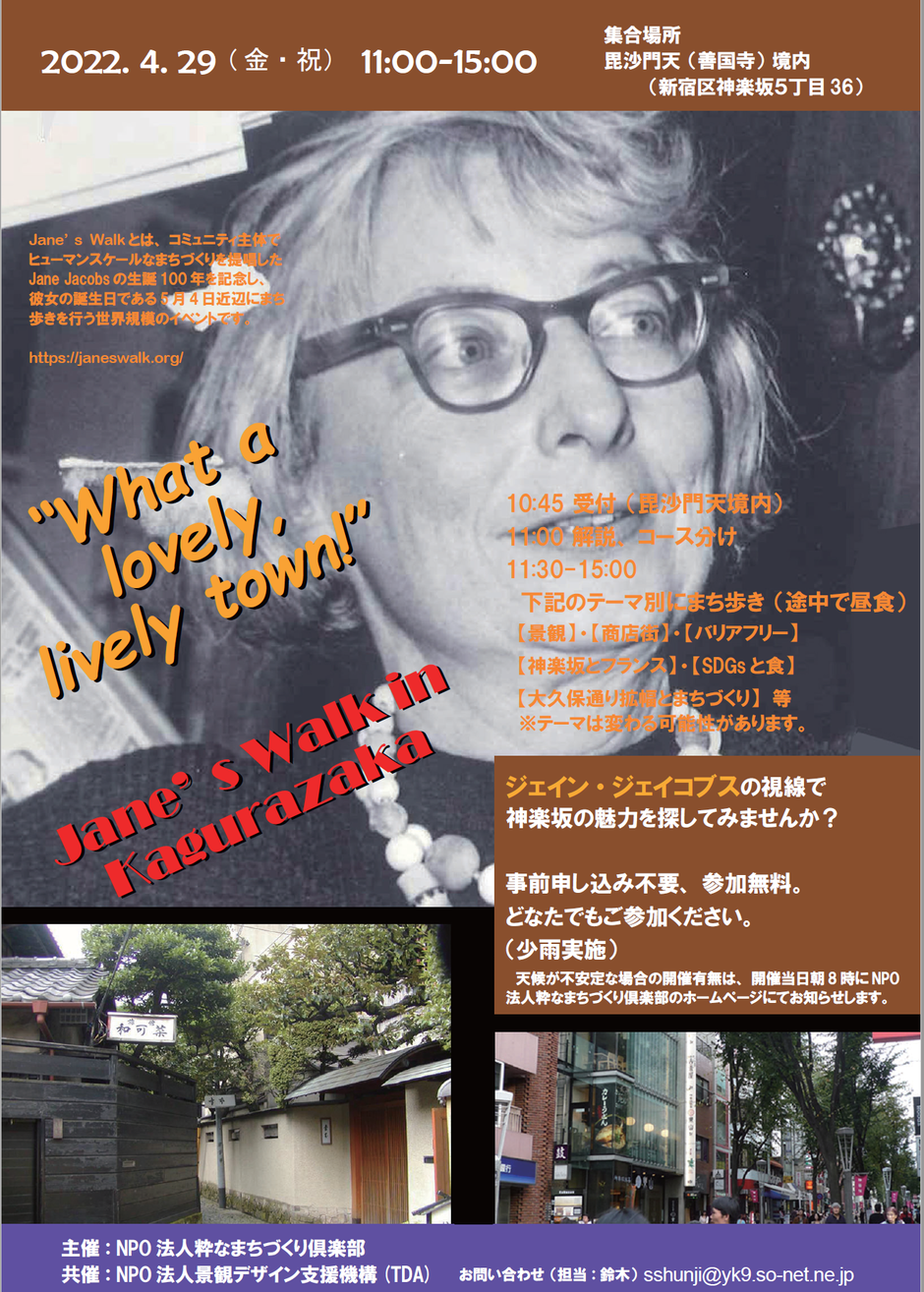 ジェーン・ジェイコブス(1916-2006)はジャーナリストであり、ヒューマンスケールでコミュニティ主導のまちづくり活動の実践的のリーダーでした。Jane’s Walkは彼女の生誕100年を記念し、世界各地でJane Jacobsの視線をもってまちを歩き、その良さを再確認しようというイベントです。彼女の誕生日である5月4日近辺に、世界の約200の都市で実施されています。日本では2017年から東京の中野、向島、神楽坂などで実施されました。神楽坂では2019, 20年はコロナ禍のため実施できませんでしたが、今年は再開します。みなさんでテーマを持って地域を歩き、あらためてまちの良さや課題を確認し、共有しましょう。