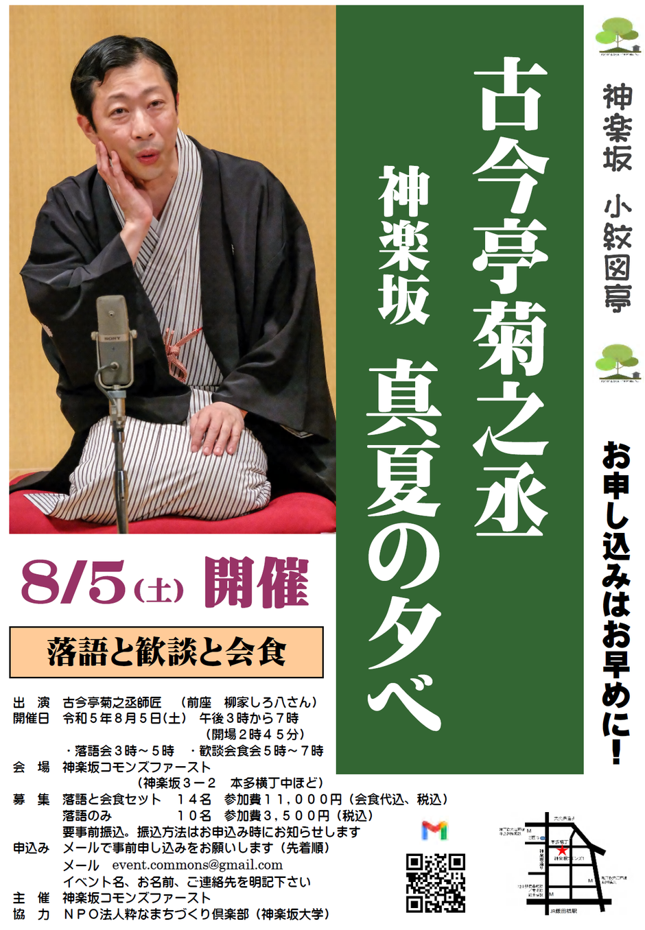 | 招募人數 | 落語と会食 14名 参加費11,000円(会食代込、税込) 落語のみ 10名 参加費 3,500円(税込) |