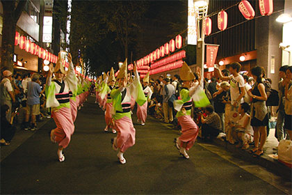 今年で45回目を迎えた阿波踊りと、昔の夜店全盛時代を再現するかのようなほおずき市。毎年この2つのイベントを合わせて「神楽坂まつり」と呼ぶ。坂下の交差点から赤城神社まで約700メートルの坂道が阿波踊りの舞台となる。都内でも上り坂を踊りながら上るので「最もきつい阿波踊り」とも言われている。ここ十年は、神楽坂人気を追い風に、年々来場者数は増え、4日間で約6万人を超える。
