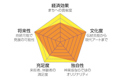 起源はアユミギャラリーの鈴木喜一氏が発案し、「ここは牛込神楽坂」の編集兼発行人の立壁正子さんとその仲間が中心となってはじめたイベント。「まちに飛び出した美術館」と名付け、アートイベントとしてスタートした。回を重ねるうちに参加者や参加団体の枠が広がり、伝統芸能から現代のパフォーマーまでが参加。今や神楽坂の市民文化祭といわれる。目玉となるのは、最終日の「坂にお絵描き」、芸者さんの世界にふれる「ざ・お座敷入門」、「化け猫フェスティバル」、今年復活する「ギャルソンレース」など。ボランティアの希望者は年々増え、海外からの留学生までもが加わり、イベントを支えている。