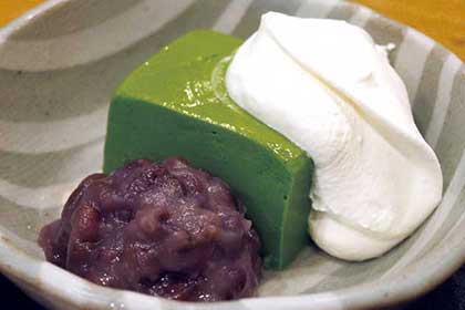 評判の抹茶ババロアは、特上の抹茶の風味と、丹波の大納言を用いた自家製つぶ餡のアクの抜けた甘味が味を引き立て合う。白玉は、毎朝白玉粉100%でつくり、そのツルンとした食感とこし餡ののどごしが絶妙だ。