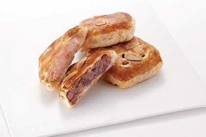 神楽坂饅頭、自家製パイ皮の中身は、レーズン入り小倉餡と、炒ったクルミ入り白餡の2種