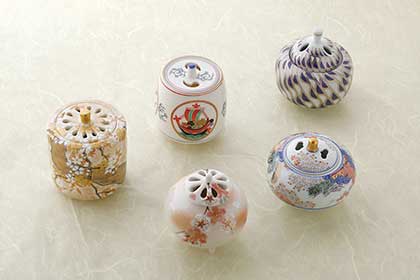 左上から「桜香炉」酒井抱一の写し、椿屋オリジナル、京焼/21,600円、「淡紅桜香炉」京焼/8,640円、「錦宝船鶴絵香炉」有田焼/4,860円、左下から「春秋文豆丸香炉」有田焼/6,480円、「銀彩紫波文香炉」有田焼/8,640円(すべて税込)