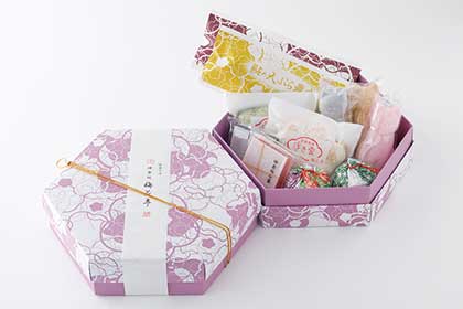 昨年度は4代目当主が外務省の「日本ブランド発信事業」のプロジェクトに選ばれてイギリスに派遣。ロンドンやエジンバラで日本人が持っている季節感に対する繊細な感覚を、和菓子に込めて表現し、日本文化の紹介に貢献している。お店の商品は、ほとんどが商標登録され、梅花亭オリジナルばかり。ギフト用セットにも、その銘菓を揃えている。