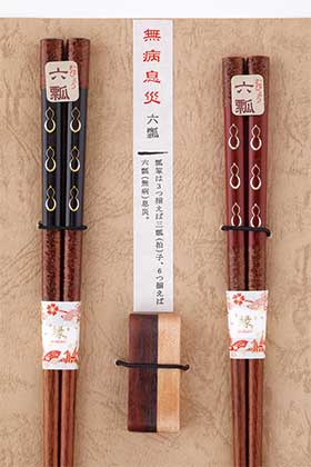 一番多いお客様は、ギフト用。ご結婚やご両親の還暦、喜寿など節目のお祝いに家族から贈られる場合が多い。たとえば写真の商品は、ひょうたん模様が6つ、螺鈿でできていて「無病息災」を表している。家族の健康や長寿を願うギフトにはぴったりと言える。また適正な箸の長さ、使いやすさを見つけるための体験用箸やボードなども用意してある。