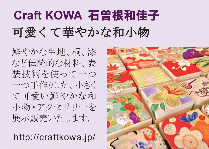 | あかぎきもの百人 和小物の展示販売とワークショップ、お茶とお菓子のご接待、投扇興体験、 伝統芸能のご紹介と。多彩なプログラムを盛り込んで開催いたします。 |