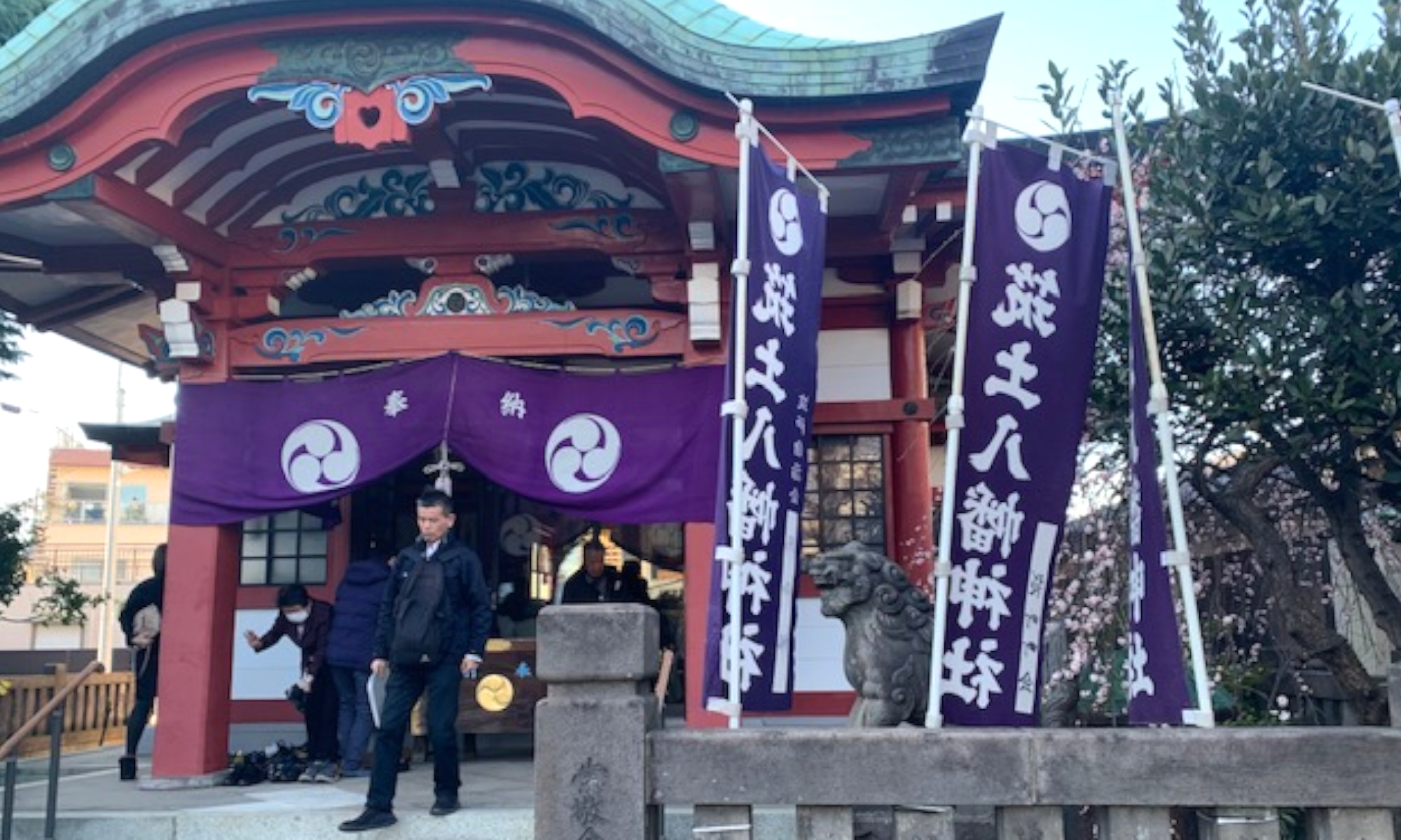 ペットと一緒にお参りができる神社としても有名な市谷亀岡八幡宮では、今年も干支にあたる善男善女が、境内で盛大に豆まきを行ないます。「皆様の一年が健やかで幸多きものとなり、心穏やかな日々を過ごされますよう、心よりお祈り申し上げます。」と、梶 謙治宮司よりお言葉をいただきました。豆まきでは恒例の福袋も10名の方に当たりますので、災厄を祓って福を授かってください。