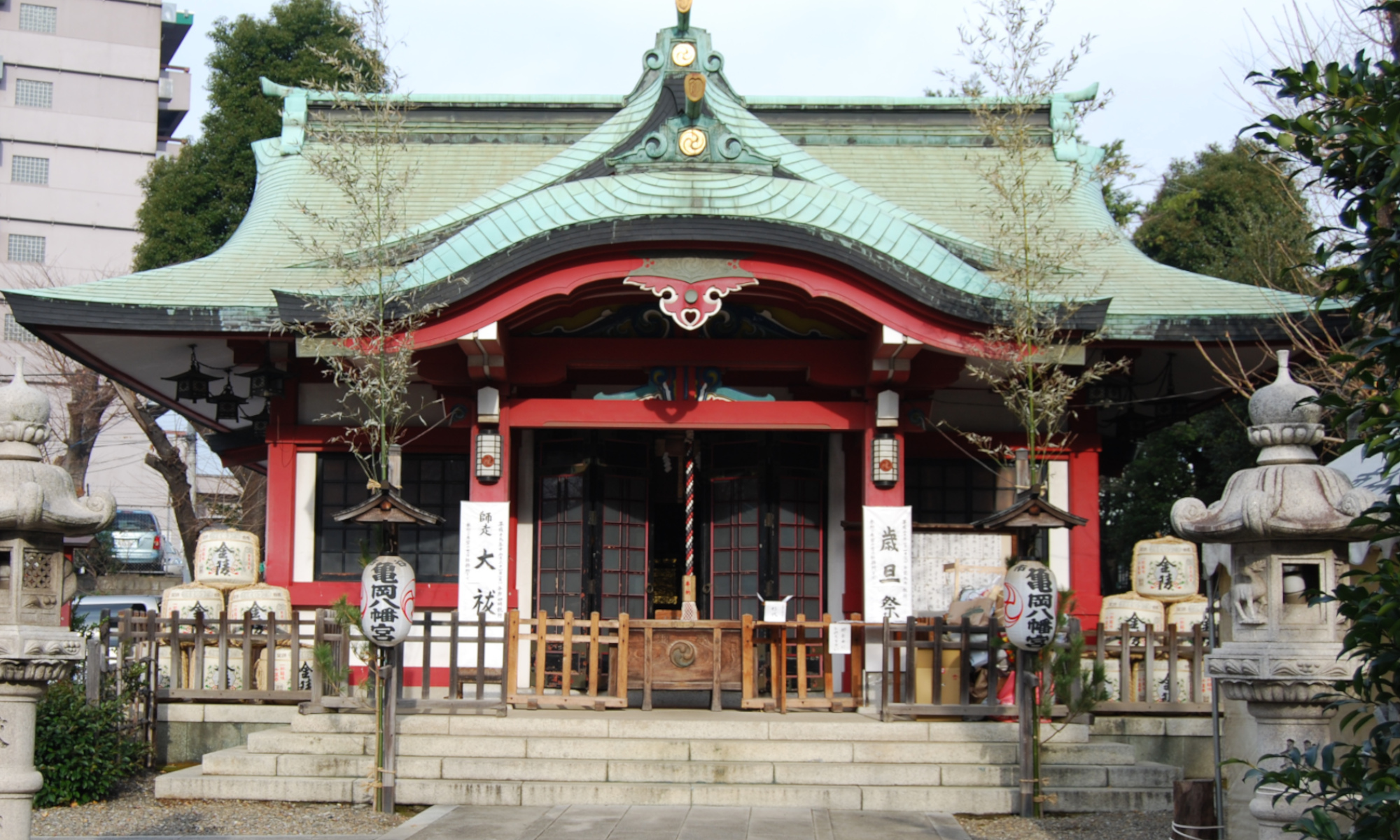 太田道灌が江戸城西方の守護神として鎌倉の鶴岡八幡宮を勧請したことがはじまりです。三代将軍家光や将軍綱吉の母桂昌院からも厚く信仰されていました。市谷亀岡八幡宮には、太田道灌が奉納した軍配団扇、江戸時代(一八〇四)に建立された銅鳥居など、多くの文化財が残されています。